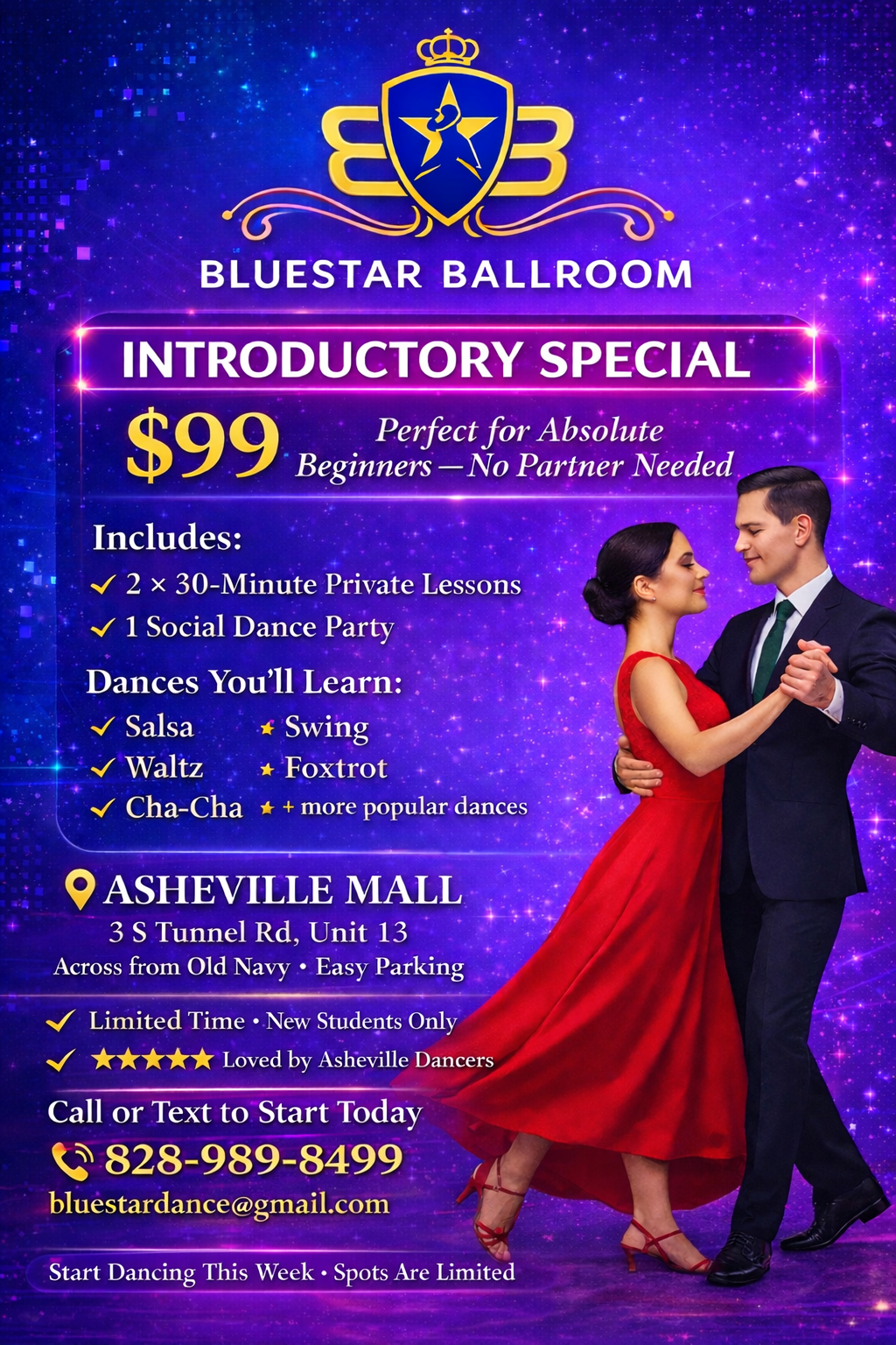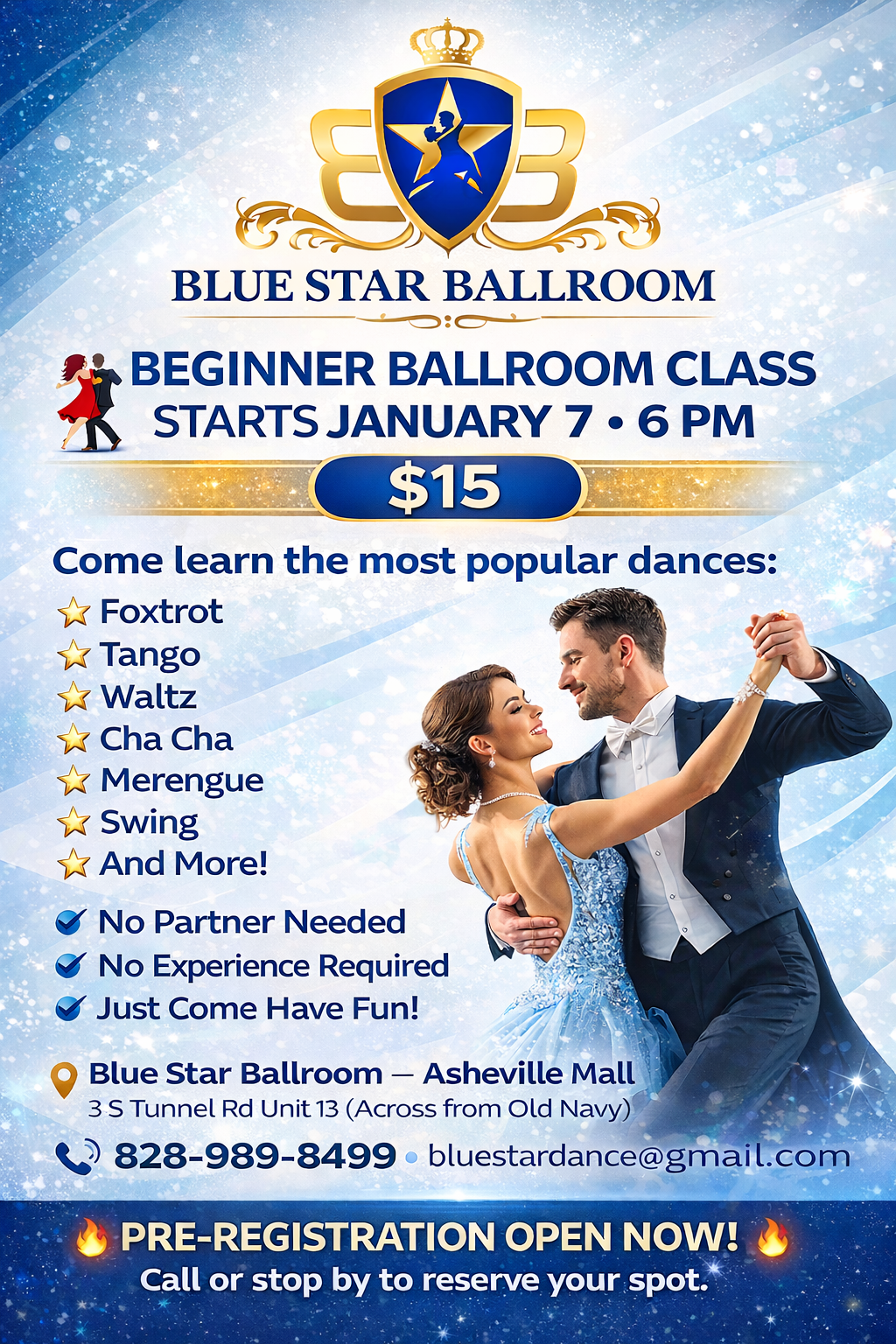 Join us at Blue Star Ballroom for an unforgettable dance journey. Experience the joy of movement and the elegance of ballroom dancing in a welcoming environment.
